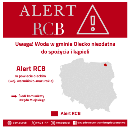 Sytuacja w powiecie oleckim jest szczególnie poważna i ma charakter kryzysowy. Alert RCB został wysłany do mieszkańców aż 41 miejscowości, ostrzegając przed obecnością bakterii E. coli w wodzie wodociągowej. Skażenie objęło m.in. Olecko oraz liczne okoliczne miejscowości, co doprowadziło do poważnych utrudnień w codziennym funkcjonowaniu regionu. W wielu miejscach zamknięto szkoły, a dostęp do bieżącej wody został ograniczony lub całkowicie wstrzymany.