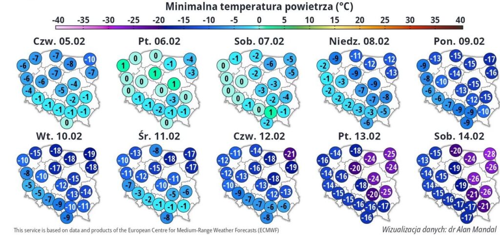 • Najzimniejsze dni mają nadejść 14–15 lutego, kiedy to – według IMGW – na północnym wschodzie kraju może być nawet -28°C.