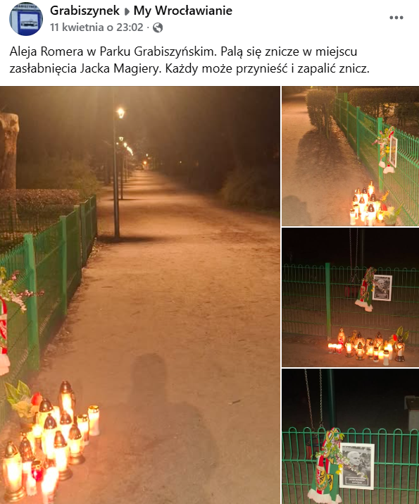 Aleja Romera w Parku Grabiszyńskim. Palą się znicze w miejscu zasłabnięcia Jacka Magiery. Każdy może przynieść i zapalić znicz